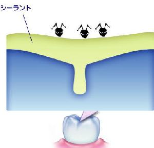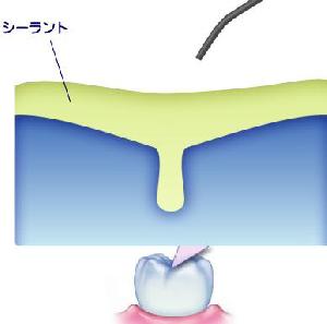 奥歯の溝の部分は非常に食物がたまりやすく、歯ブラシが届きにくいため、歯がはえてもすぐにむし歯になってしまいます。そこで、むし歯になる前に溝の部分に歯を削らずにレジンという素材をうめこむ処置をして虫歯になりにくくします。
