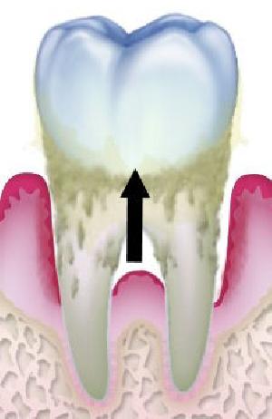 かみ合わせが変わることとは歯周病が悪化するとよく起こります。とくに歯が浮いた感じがするのは図のように根分岐部に膿がたまり歯を浮かせてしまうからです。