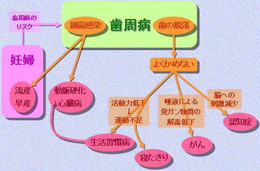 しっかり噛む『咀嚼(そしゃく)機能』は、特に高齢者において脳の働きを高め、認知症(いわゆる『老人ぼけ』)を防ぐ働きがあると考えられています。したがって、歯が無くなったりぐらついたりしてしっかり噛めない人は、ぼけやすくなる可能性があります。さらに、歯周に病原菌が感染すると動脈硬化や心臓病、糖尿病、妊娠上のトラブルなどにも影響を及ぼすと考えられています。当歯科医院では、歯周病の予防と治療に重点を置き、患者さんとともに徹底した歯周病の原因除去に努めています。